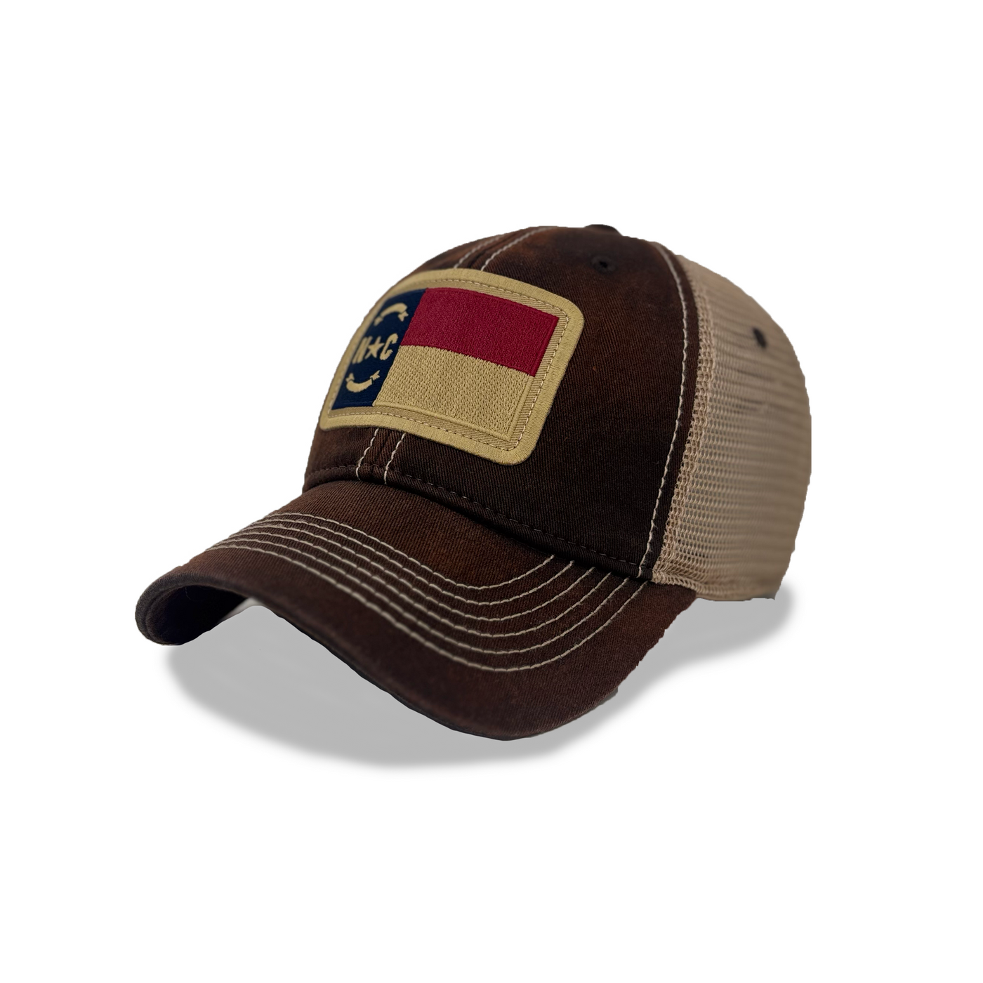 Trucker hat with khaki colored mesh backing, grey cotton front panel and bill with tan stitching. Ballcap has an embroidered patch of the North Carolina flag in in the center.