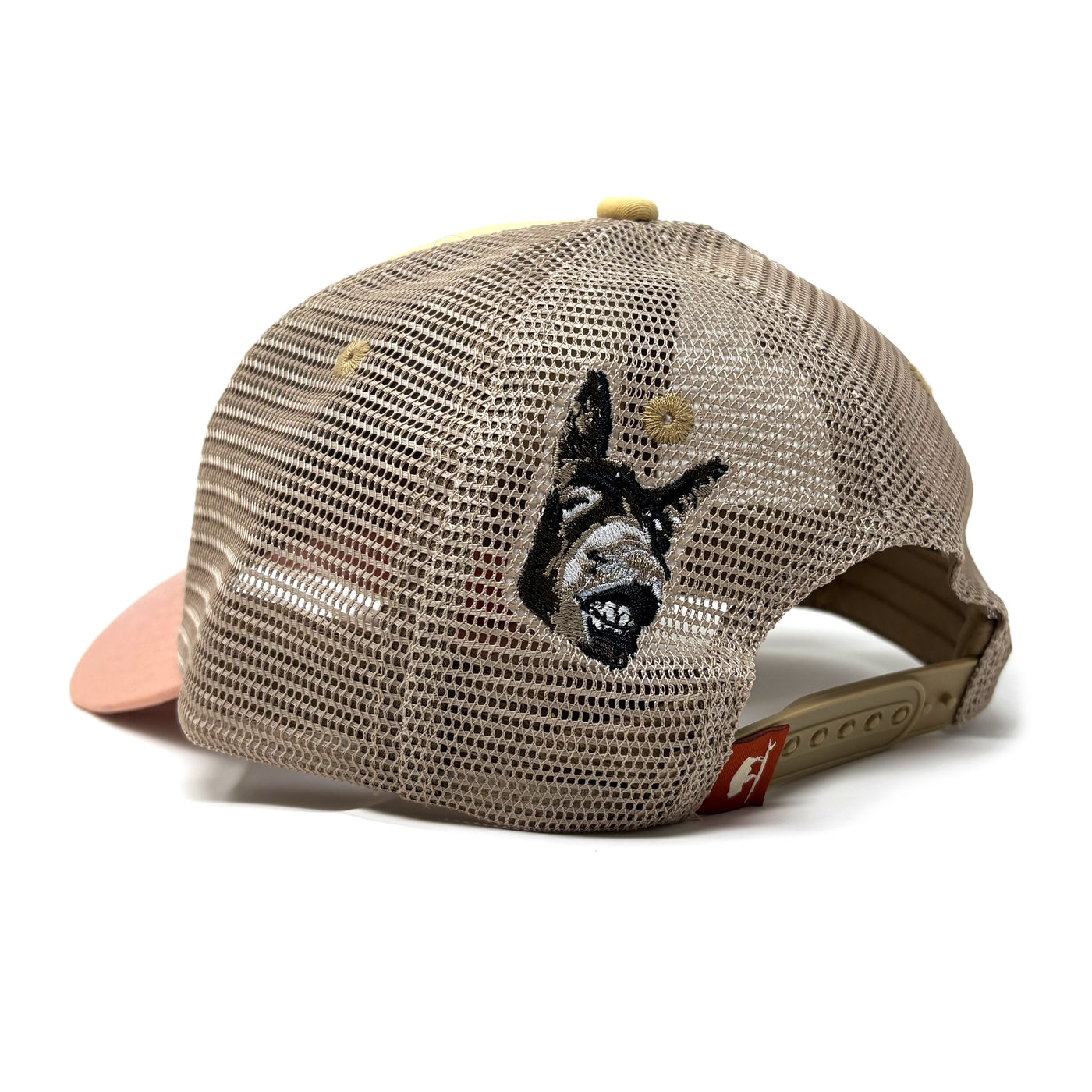Surfing Jackass Structured Trucker Hat, Sandhills Gold, medium profile, structured trucker hat is now available. The beast of burden, a domesticated donkey has been working with humans for over 5000 years. The male donkey is called a Jack; thus, we now have a surfing donkey or jackass. Let's give Jack a little recreation time and let him surf. You will notice a very detailed smiling donkey embroidered on the back of the hat. These are structured hats and have not been Salt-washed™ for softness and fading. Our structured hats are more stiff and the colors are brighter.  The fit profile is very similar to our popular vintage-style Salt-washed™ trucker hats.  Adjustable snap in the back allows for a proper fit and we have color-blocked this style with a mesh color, front panel color and bill color. We think we have designed a hat with a unique look and should be a favorite. Shop Surfing Jackass Structured Trucker Hat only at S.L. Revival Co.