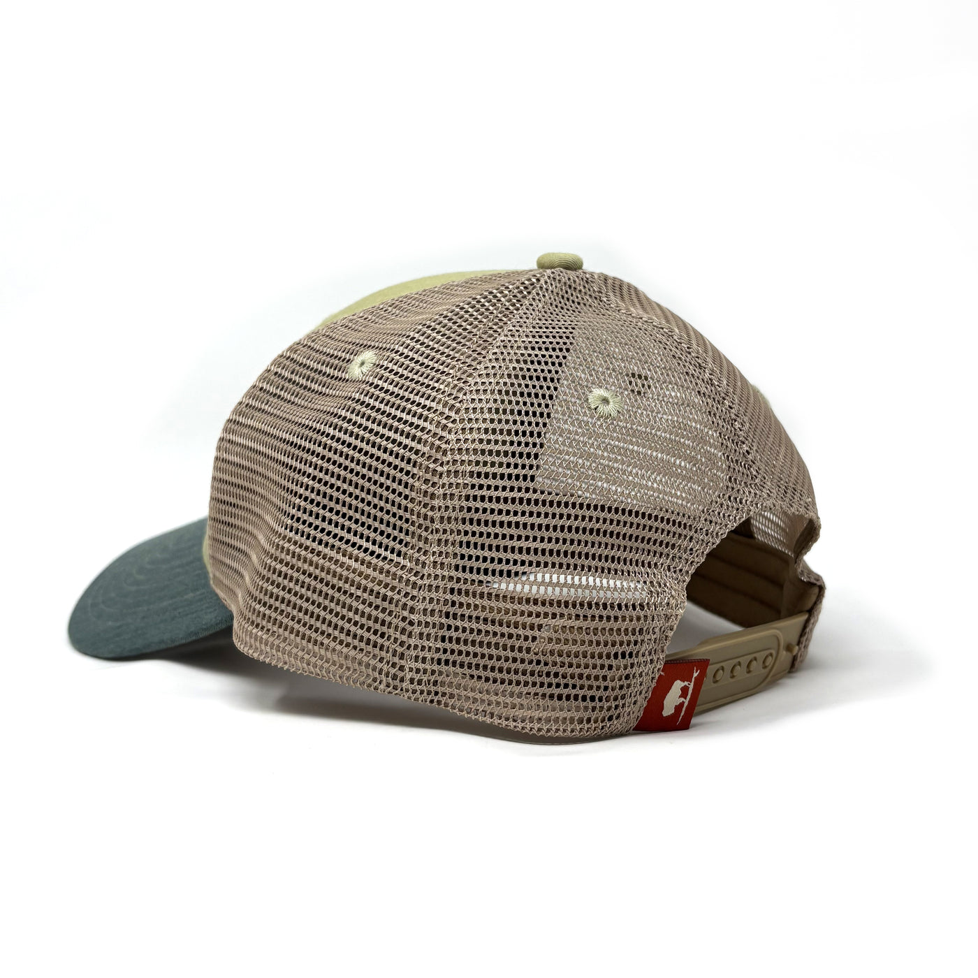 NEW... Surfing Sasquatch Structured Trucker Hat, Dismal Swamp Green, medium profile, structured trucker hat is now available. The North American Bigfoot is now a surfing extraordinaire. Structured hats have not been Salt-washed™ for softness and fading. These hats are more stiff and the colors are brighter.  The fit profile is very similar to our popular vintage-style Salt-washed™ trucker hats.  Adjustable snap in the back allows for a proper fit and we have color-blocked this style with a mesh color, front panel color and bill color.  We think we have designed a hat with a unique look and should be a favorite. Shop Surfing Sasquatch Structured Trucker Hat only at S.L. Revival Co.